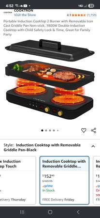 Have a brand new cooktron double induction cooktop with removable griddle and lid. First $80 cash gets it. Located in clinton sc.