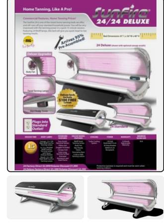 This tanning bed comes with a built in fan and has a Bluetooth speaker. Works great and I only used it maybe 12 times in the past year.SunFire 24 bulbs. Located in Salem SC