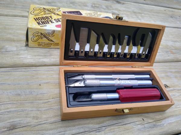 2 knife/tool kits in original wood cases. Complete sets, never used.