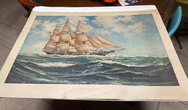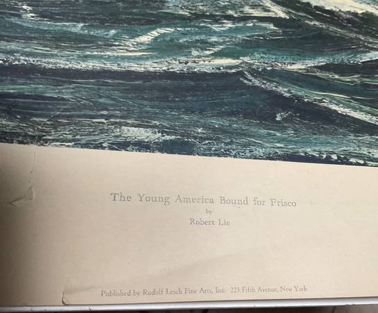 The Young America Bound for Frisco by Robert Lie and published by Rudolf Lesch Fine Arts is an unframed print in fair condition with some tears along edges.