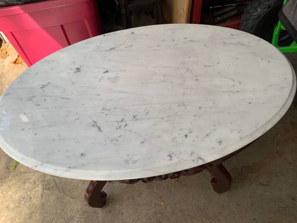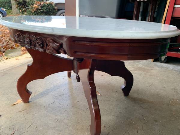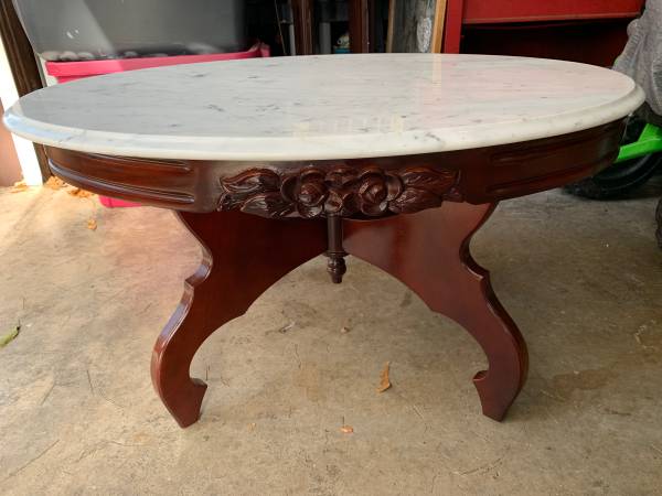 Mahogany marble top coffee table, 21 1/2” x 33” and 18” tall. The removable beveled marble is in excellent condition. The base is decorated with carved flowers at the top on both sides of the table....