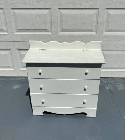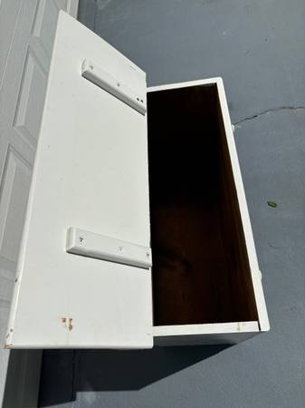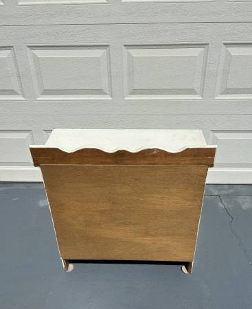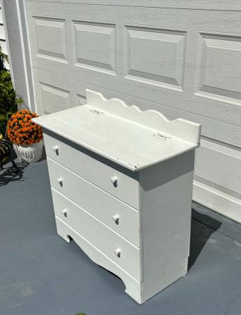 Painted white years ago so it has that old paint patina. The knobs are decorative and there are no drawers.