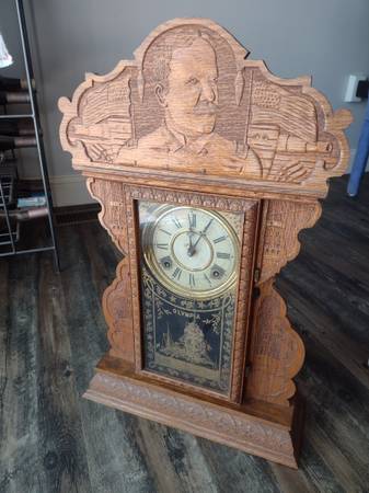 Welch Branded, "Admiral Dewey and Olympia" Gingerbread style Mantle/Wall clock: Fully functioning and keeps excellent time. comes with Original winding key and pendulum. Was previously hung via pictured rear nail, but sits nicely on shelf or mantle. Pressed Blonde Oak. Intact glass and functioning door latch.