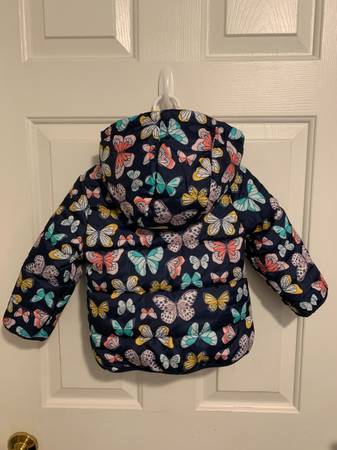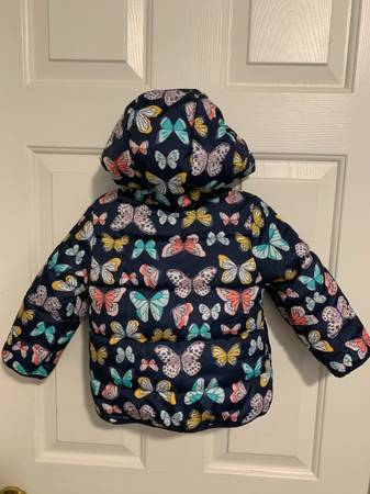 Like new Sz 2T little girls Ski Jacket with hood Navy blue with butterflies and pink fleece lining and pink zipper by Carters winter cold