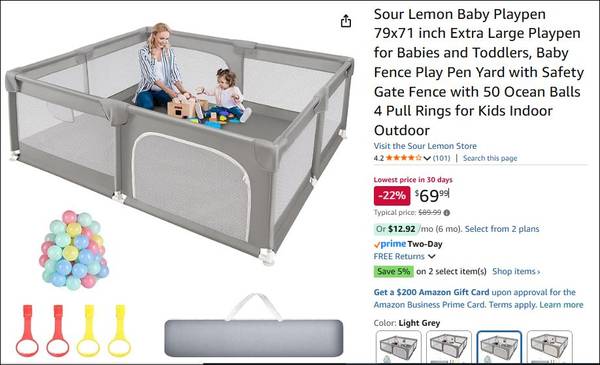 Sour Lemon Brand Baby Playpen - 79 x71 inch Extra X-Large Playpen for Babies and Toddlers - Baby Fence Play Yard with Safety Gate - Includes 50 Colorful Ocean Play Balls + 4 Pull up Rings + Storage Bag