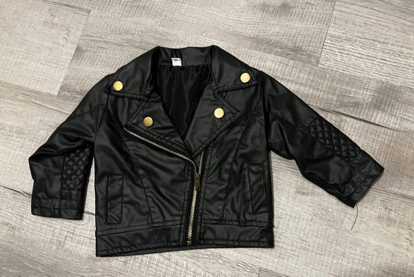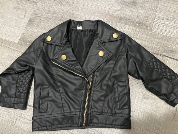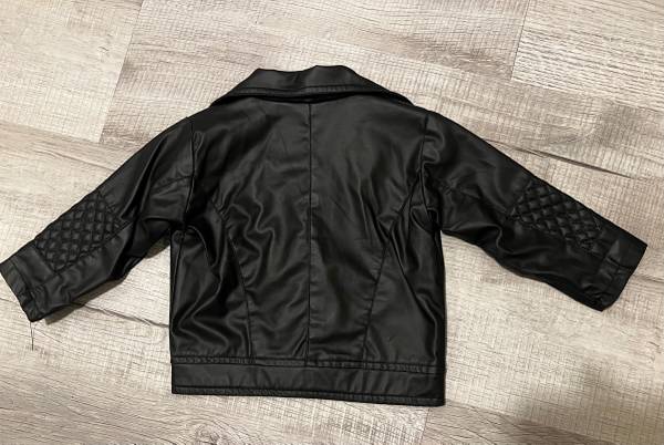 Cool style with leather look jacket size 5. excellent condition Full zipper with 2 pockets Quilted look on elbows/arms