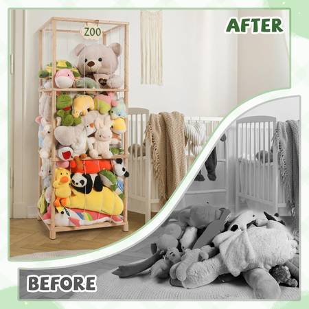 Sturdy & Durable Construction: The stuffed animal & toy storage zoo organizer is designed to handle the weight of a large quantity f toys. Unlike other flimsy options, such as PVC pipes, this container stands firm without bending or breaking, making it safe and secure for use in nurseries, playrooms, and bedrooms.