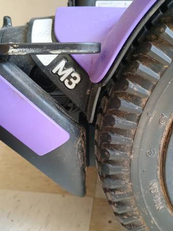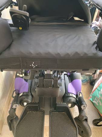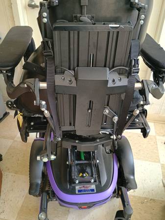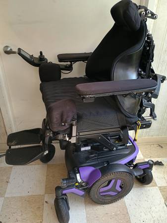 This is a Permobil Corpus M3 electric wheelchair. This dazzling purple power chair elevates, tilt, recline and leg rests, digital joystick, auto-brakes, seat belt, power port for devices, phone holder with charging cord, lights, turn-signals