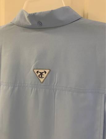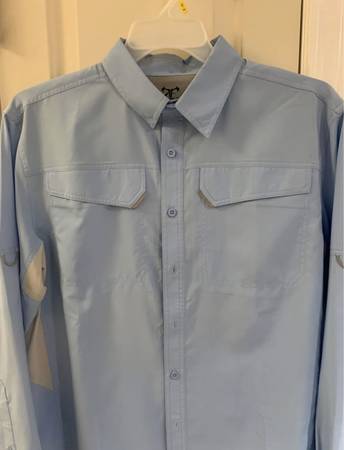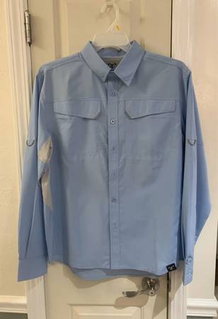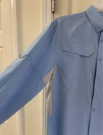 New no tags Size Medium Lt Sky Blue long sleeved Fishing Shirt by True Timber Gray trimmings - under sleeves, pocket tabs & velcro, sleeve tab loops and back vent Button up cuffs and True Timber...