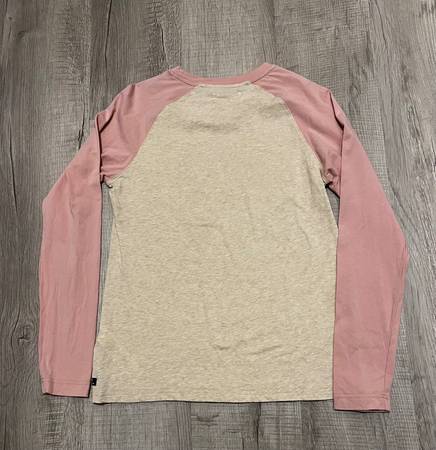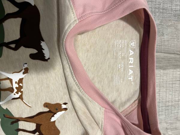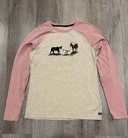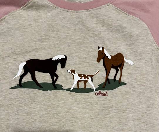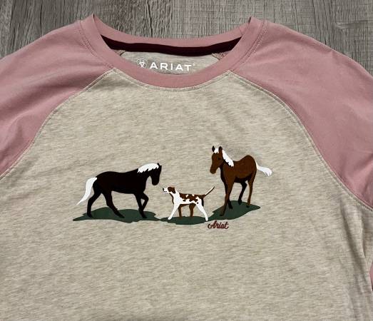 ARIAT Youth Pasture scene 2 horses & dog Oatmeal Heather/Ash Rose Long sleeve in excellent condition Horse baseball tshirt