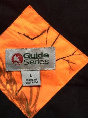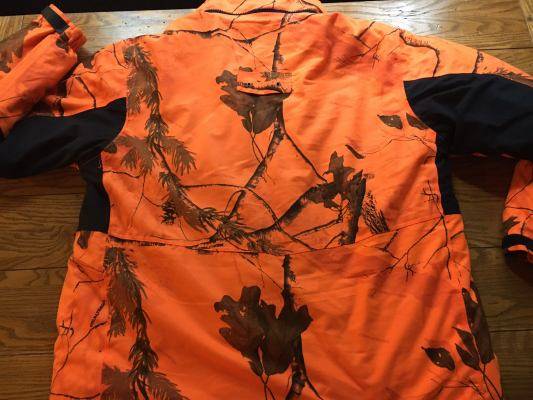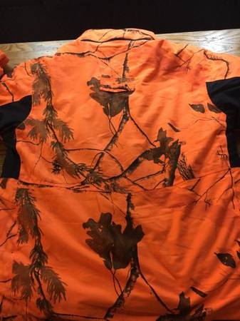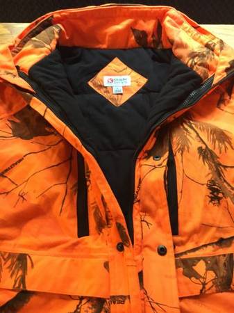 I have a mens sz Large two piece, zip in lined thinsulate winter jacket great for hunting, skiing, or everyday use in winter and fall seasons. This is a rare designed blaze orange tree bark camo jacket. It has a Flannel insulated type, zip in, inner jacket, designed for cold weather, or you can zip out the lining and use the lighter inner jacket for less cold days, still in blaze orange camo. This is a breathable and waterproof set of jackets. Very warm and insulated, both jacket parts, in exc condition, This new was $299, asking only $100. Hard to find item. I also have the matching winter orange blaze camo bibs, Mens size x-large (XL) for an additional $95. OR both for $190. Excellent condition and set.