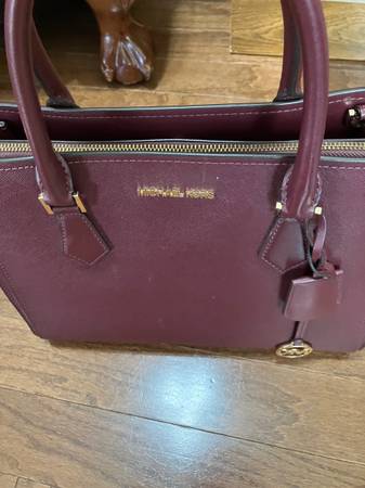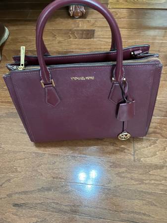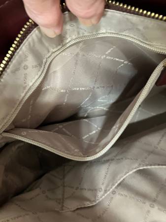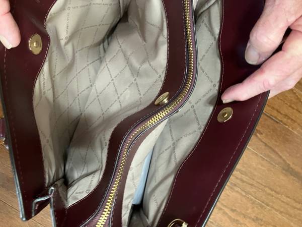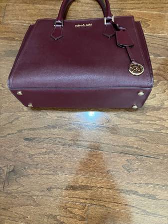 Beautiful large satchel color is so popular, right now it's the Burgundy Wine color. Leather has no scratch marks, no worn edges. Very elegant satchel also looks cute with jeans and jacket or blazer. Has a strap to make it a shoulder satchel. Two openings on each side, has magnetic snaps. The middle is a zipper. On the inside of the zipper is a holder for phone also a zipper compartment. Gold tone hardware, which includes on bottom, so your scratch never sits on the floor.