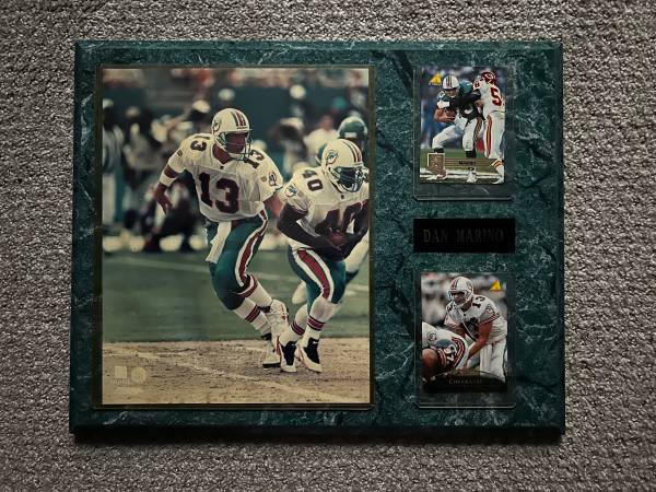 I have a large wall plaque (approx sizing 14" high x 19" wide) containing a large photograph and 2 Dan Marino collectible cards, which would make a great gift to a Miami Dolphin / Dan Marino fan. I am only asking $25