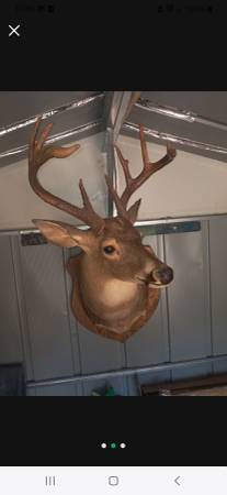 Mounted 10 point whitetail buck could possibly be considered 11 point, you can tell where one had broken off but overall in great shape. Has wooden back to make it easier to hang. MUST PICK UP.....