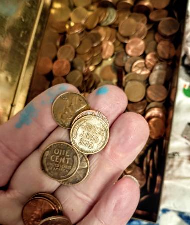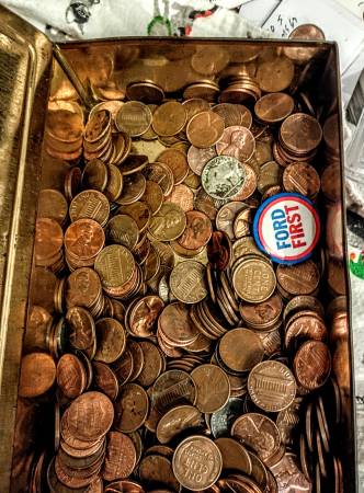 Antique metal box of estate wheat back and copper pennies from collector ,should be lots of errors and varieties in the box approximately 1000 coins some Buffalo nickles old politicians button dates on pennies start from 1910 to 1970s .some are uncirculated most are brown.its a treasure hunt for someone who likes to go through old pennies . I live in Easley I can meet most any where local.must take all.$100 firm would consider trading for old marbles or partial trade