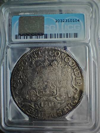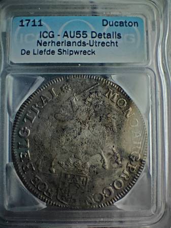 De Liefde Shipwreck Netherlands, Utrecht 1711 Silver Ducaton, Collectible condition from ICG AU55Weight: 32 gr, Size: 42 mm. You can see a year 1711 clearly on the back.