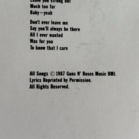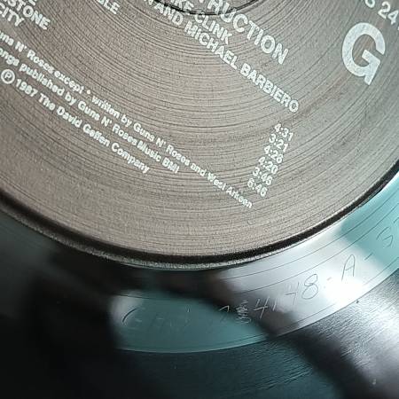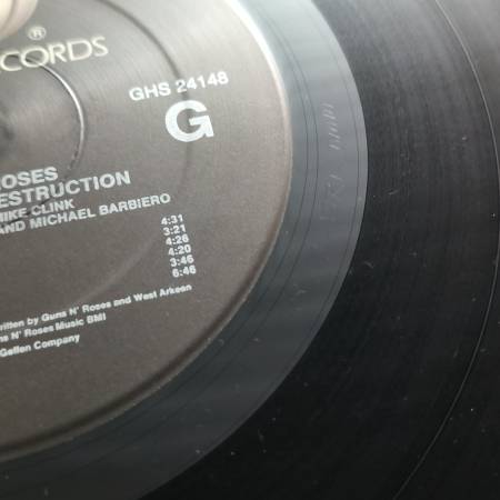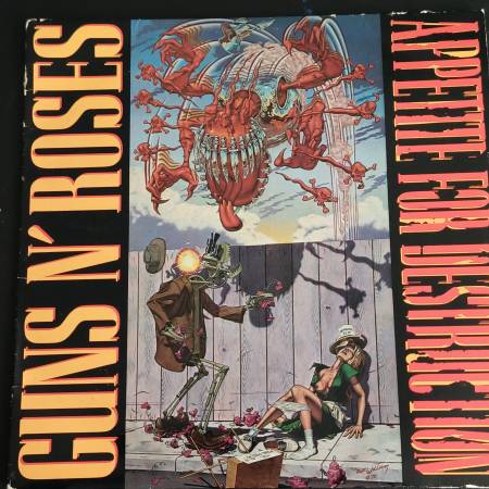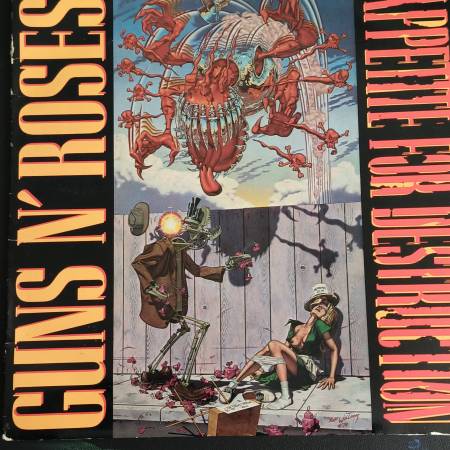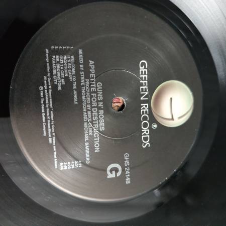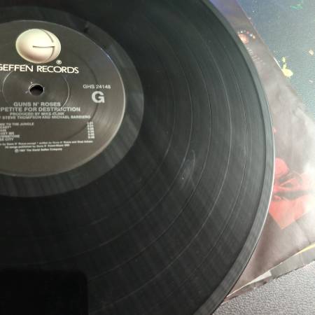The product is a first pressing of Guns N' Roses' "Appetite for Destruction" vinyl LP released in 1987 by Geffen Records. This classic album, known for its heavy metal and glam rock style, comes in a 12" format with a black vinyl material and original inner sleeve. The record grading is very good plus (VG), while the sleeve grading is fair (F). This iconic album was banned in the USA due to its controversial content, making it a sought-after collector's item for fans of hard rock and rock & pop music from the 1980s era. Sleeve has damage around the edges, all is shown in photos. Record has minor scuffing that does not effect the play of the album. Serious inquiries only.