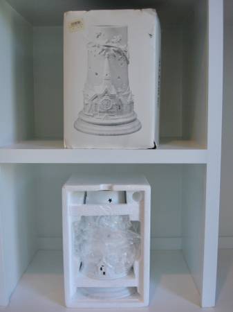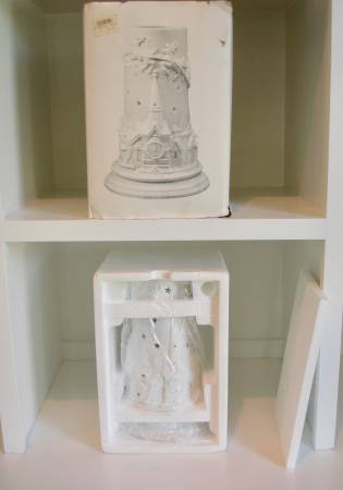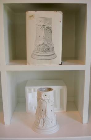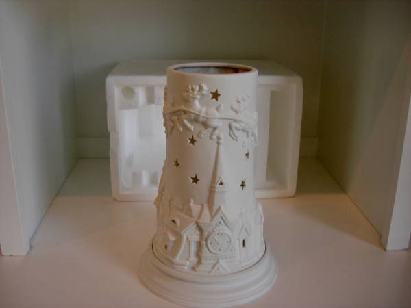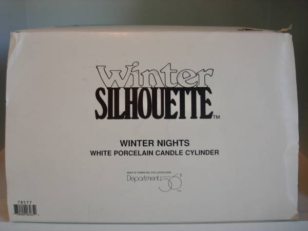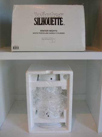 Winter Nights # 7857-7 White porcelain candle cylinder. All white bisque. Retired. excellent condition. Box has a few damp marks. Never Used.