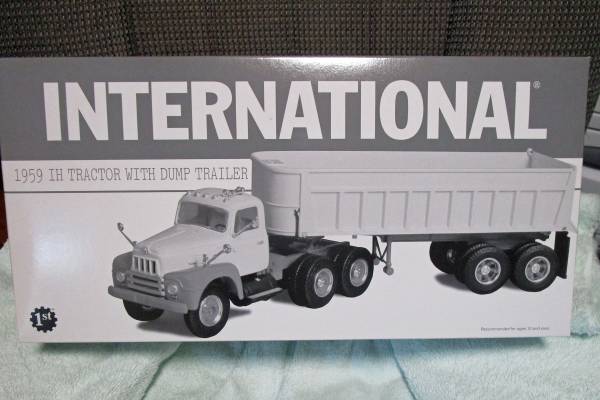 This is a 1959 IH First Gear 1/34 scale Tractor with Dump Trailer. It is New in the box. Cost $129.00 when bought. I have REDUCED from $120.00 and I am only asking $69.00 OBO! They sell for $100 +...