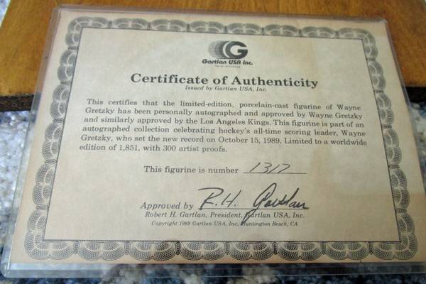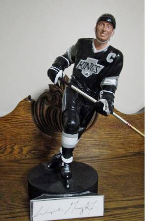 This is a WAYNE GRETZKY Los Angeles Kings AUTOGRAPHED GARTLAN Figurine. This was produced in 1989 and has been signed by Wayne Gretzky. This piece is number 1317 of only 1851 pieces that were produced. It comes with COA and original box. Figurine stands 9" tall. I have Reduced this from $350.00 to my best price and now only asking $229.00 OBO.