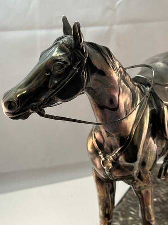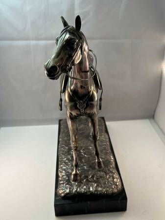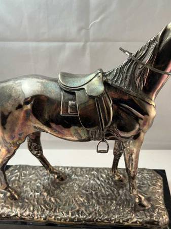 Elegant metal horse sculpture with saddle on a textured base. Jennings Bros. Artware of Distinction.