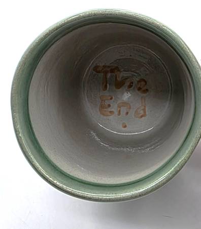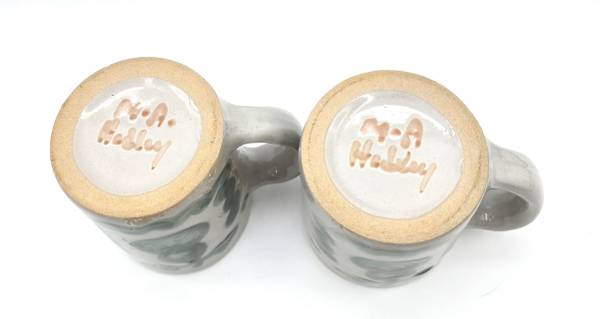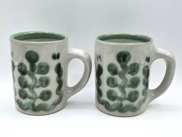 Rare set of 2 Vintage 1950s,signed by M.A. Hadley, original set of round handmade stoneware coffee mugs or tea mugs features a unique technique of Art pottery design with a charming Kentucky Folk Art Pottery pattern of green grapes and pears making them a one-of-a-kind item. Made in the United States in the 1950s -1960s. They feature a painted backstamp with a inside painted "The End" on the inside bottom, making it a true representation of the mid-century era. Perfect for all occasions, these mugs exude a rustic charm and are sure to be a conversation starter at any table setting. Perfect for unisex adults, these mugs are a must-have for any vintage lover. A perfect unique addition to any collection or occasion by adding a touch of vintage charm to your morning routine with this rare set.