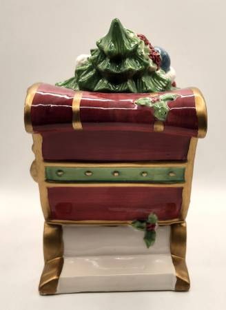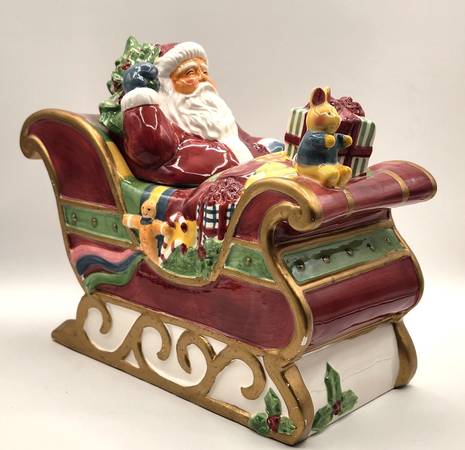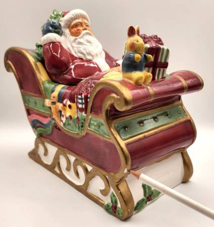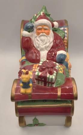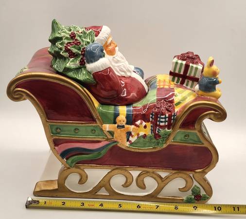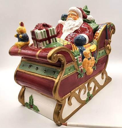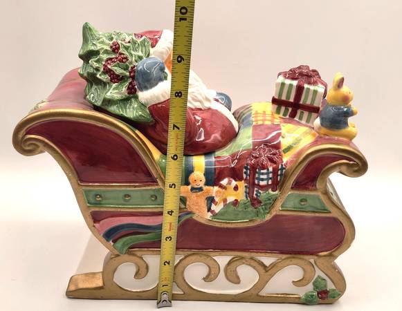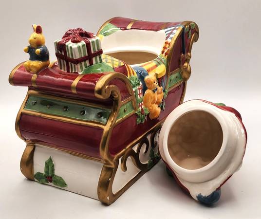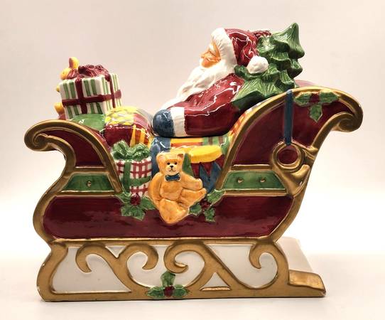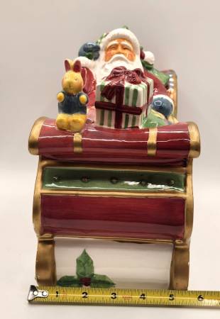 Cookie jar is in very good condition with a minor amount of imperfections. Some small spots of gold color missing on the sleigh rails.