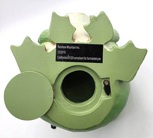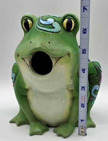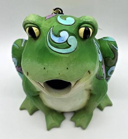 Jim Shore hanging birdhouse from his Heartwood Creek collection. The birdhouse is shaped like a frog and features a multicolor design with a matte finish. It is made of resin and is handcrafted with a production technique called batch production.