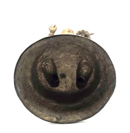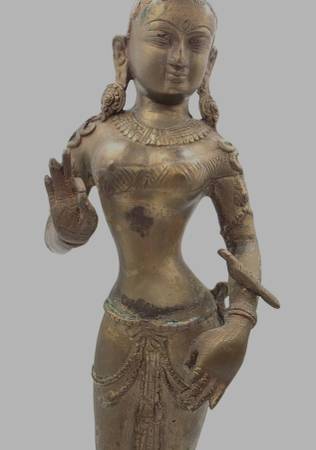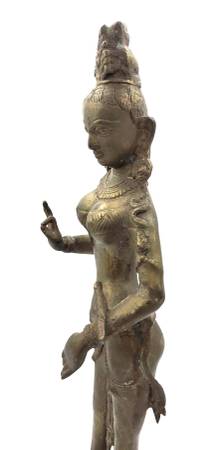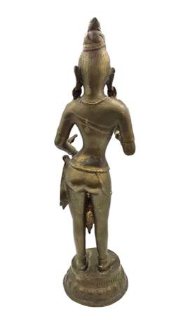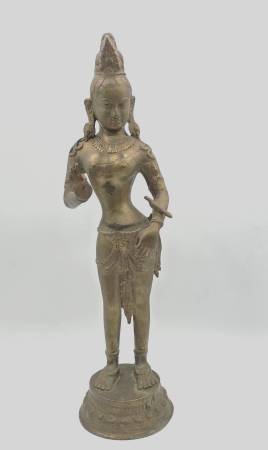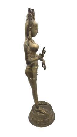 She is depicted with a parrot on her arm that symbolizes beauty, love and fidelity. it is believed to be her companion that represents a gentle and nurturing nature. Her right hand in Vitarka Mundra, represents the continuous flow of energy and wisdom, symbolizing the unending teaching and learning cycle. She is standing on a round raised bronze pedestal. The age of this statue is unknown, but we believe she is mid century or earlier.