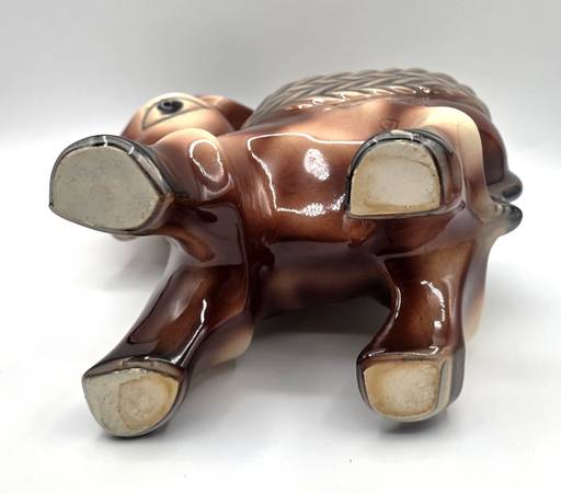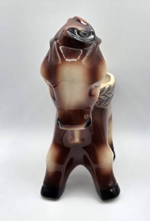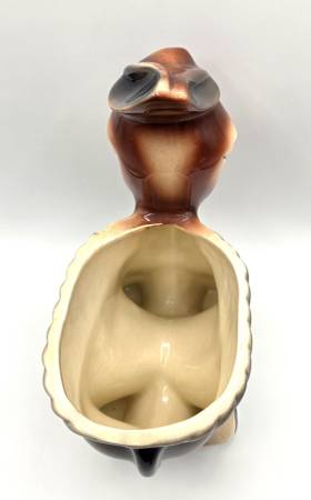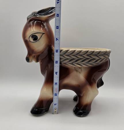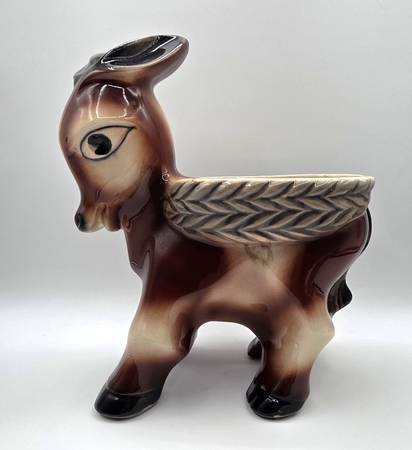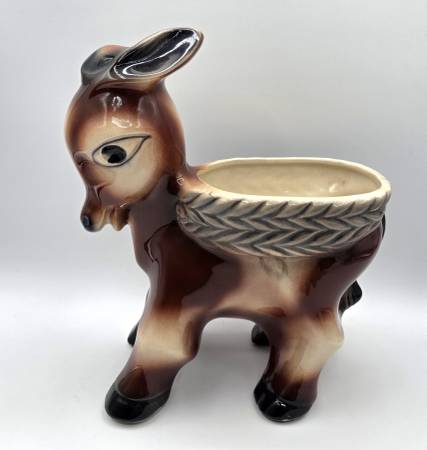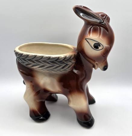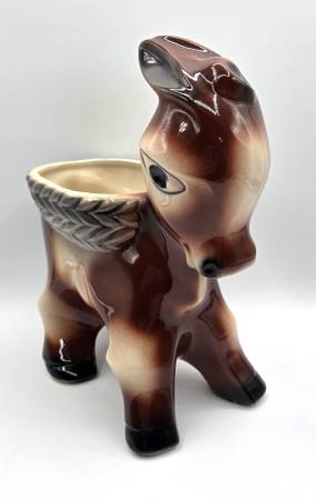 This is a adorable McCoy planter shaped like a Burro or Donkey carrying a basket look on its back is a rare and charming piece of decorative southwest pottery. Handcrafted in North America, this arts & crafts/mission style planter features a unique donkey shape and glossy finish. Made of porcelain and ceramic, this original vintage piece from McCoy is a beautiful addition to any home decor collection, showcasing the craftsmanship and creativity of that era.