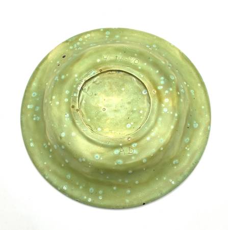 Vintage Made 4/14/70 when Ceramics was a widespread hobby form of Studio Art with a Unique glaze that is mostly green with specks of turquoise and dark brown specks.