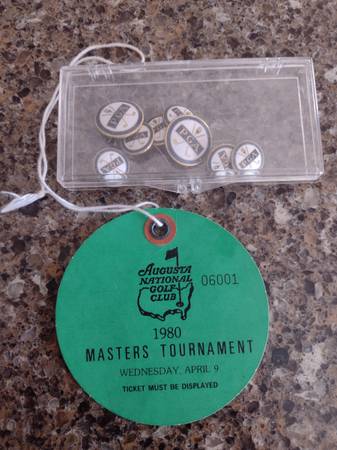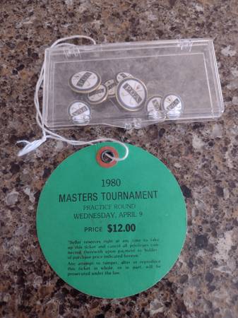 Excellent condition 1980 Augusta Masters Practice Round Ticket and Gold trimmed PGA issued shirt or coat button and Cufflink Set. 2 Buttons are missing retainer pins, but are easily replaced.