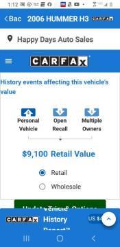 This 2006 HUMMER H3 4 DOOR WAGON/SPORT UTILITY is powered by a strong and sturdy 3.5L GASOLINE Engine and Automatic 4 speed ALL WHEEL DRIVE Transmission. Other options included are 4WD/AWD ABS Brakes Air Conditioning Alloy Wheels AM/FM Stereo Automatic Transmission CD Audio Cruise Control Front Seat Heaters Full Roof Rack Cloth Seats Power Locks Power Mirrors Power Seat(s) Power Windows Rear Defroster Running Boards Sunroof(s) Tow Hitch Traction Control- Please don't hesitate to call or text us at 864-625-0935---At Happy Days Auto Sales you will never find any pushy salesmen or hidden dealer fees.-We pride ourselves on being a fair , honest and friendly home town dealership you can trust and come back to time and time again. We have several lenders and can get you approved today. --Please don't hesitate to call or text us at 864-625-0935--- ----HAPPY DAYS AUTO SALES 605 ANDERSON STREET, PIEDMONT SC 29673--- Please feel free to visit our website today to view more of our inventory, warranty and financing information--- Vehicle to Carsforsale.com, FreeClassifieds.com, 160+ Regional Websites, and Twitter. https://www.happydaysautosales.com (Just copy and paste this link into your browser)- or call or text us at 864-625-0935HAPPY DAYS AUTO SALES 605 ANDERSON STREET, PIEDMONT SC 29673----- or visit our website today to view more of our inventory, warranty and financing information-https://www.happydaysautosales.com. We have several lenders and can get you approved today --Please don't hesitate to call or text us at 864-625-0935 --HAPPY DAYS AUTO SALES 605 ANDERSON STREET, PIEDMONT SC 29673- Please feel free to visit our website today to view more of our inventory, warranty and financing information- https://www.happydaysautosales.com (Just copy and paste this link into your browser) - or call or text us at 864-625-0935