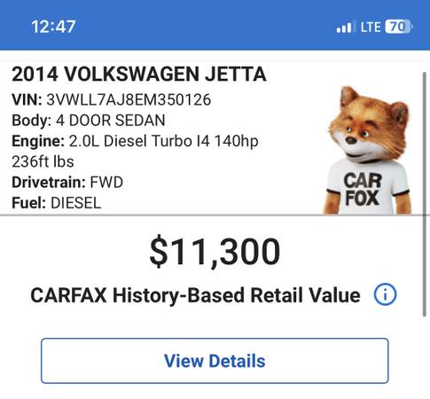 At 104,000 miles its just getting started for a diesel. Comfortable midsized car with a cavernous trunk. Standard rubber VW mats, alloy wheels and all the nice VW standard features like heated seats, power, Bluetooth, and TPMS