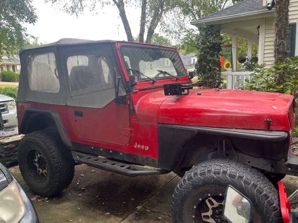 Red Jeep Wrangler. Camel colored top. Winch on the front 4 wheel drive standard shift. All new LED lighting. Oversized wheels. Comes with new set of rims and several other accessories. Would be grateful vehicle for someone who likes muding and tinkering. Owner passed away so trying to sell quickly. We have the title. Asking $6000 or best offer.