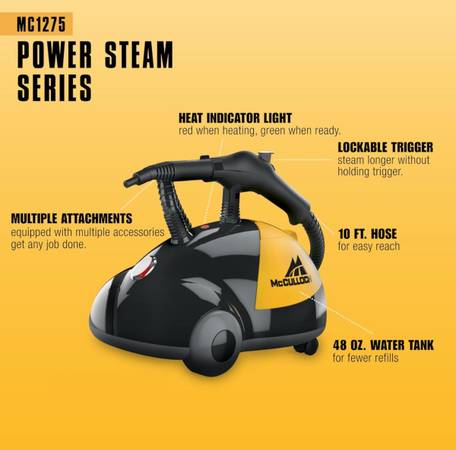 McCulloch MC1275 Heavy-Duty Steam Cleaner, 45 Minute Runtime, 18 Accessories: Mop Head, Brushes, & More - Built for Home, Tile, Grout, Carpet, Furniture, & Personal Car Detailing
