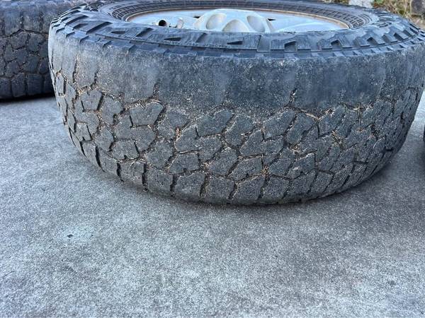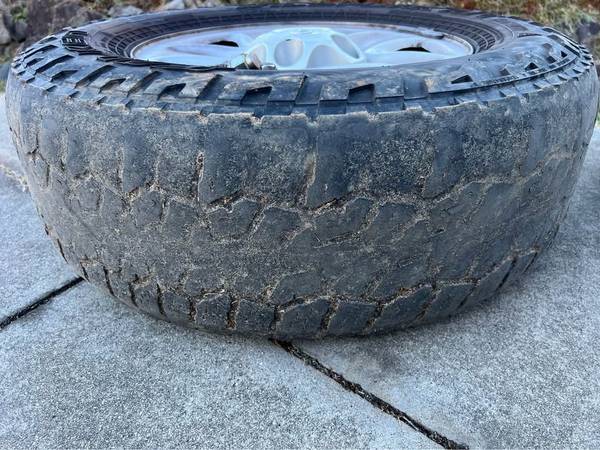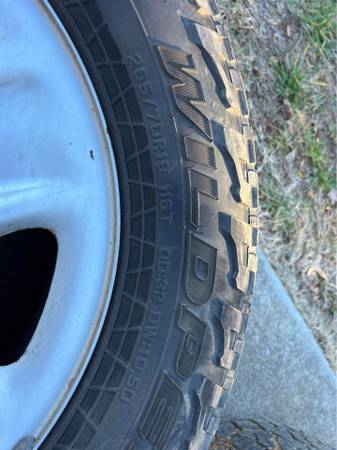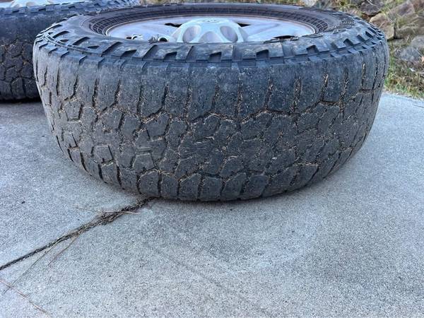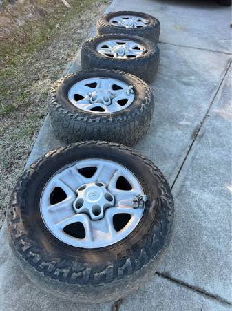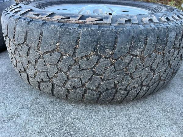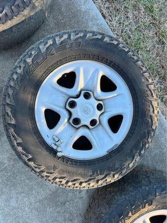 Factory steel wheels, complete with center caps, lug nuts, and tires (tires are not in good shape, but do hold air). The lug pattern is 5x150. The wheel diameter is 18-inches. The wheel width is 8-inches. The wheel offset is +60mm. The tires are Falken Wildpeak A/T’s and are size 265/70/18.