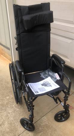 Medline reclining wheelchair, 16” seat, durable vinyl, 300# weight limit, reclines 90-140 degrees, like new condition (foot/leg rests included). Retails for $300