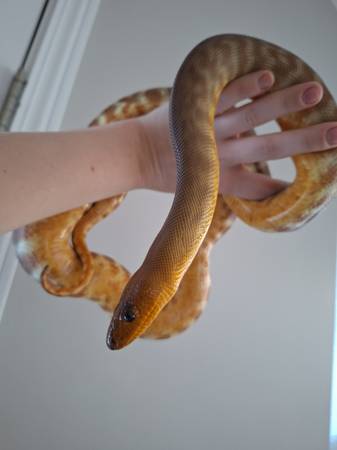 I'm here to rehome my CBB woma python, Spoingus. He is around 4 years old and produced by Leftside Reptiles. Hes pretty docile but a bit headshy, but has never attempted to bite because of it. He eats ONLY frozen thawed chick's, I've tried to offer both live and frozen rodents multiple times but he will not take them. So his new home must have a supply of them.