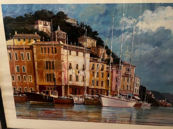 large Framed Print ~ Bella Italia Italian Mediterranean Coastal Villa Harbor Picture Marina view measures 38"x26" by Reyn Reynolds picture boats art