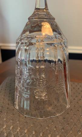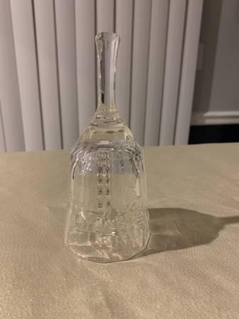 Crystal clear bell depicting Santa in a sleigh pulled by a reindeer through the woods Says 1979 on back approx 6.5” high