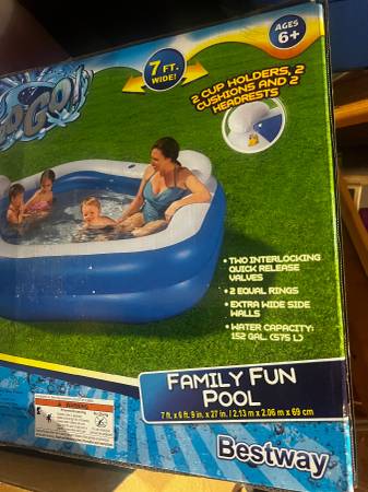 NEW still in original box Family Fun Pool 7' x 6'9" x 27" deep 152 gallons water capacity 2 cup holders, 2 cushions and 2 headrests Bestway backyard sleepover fun movie night