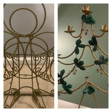 *~Compact metal angel stands 25" high and 18" wide at the widest part. Stands on its own and Folds up for compact storage *~Metal Christmas Tree to hold candles (or not) is 24" high and 22" at its...