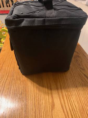 Insulated soft-sided cooler bag/lunch box with zipper top and bungie cord on top