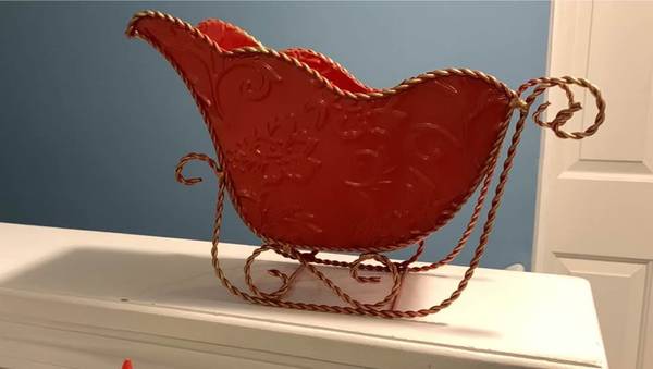Pretty red & gold metal Christmas decor  Approx 11.5” long x 7.5” at highest point x 4.75” wide