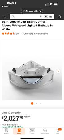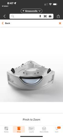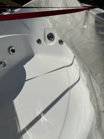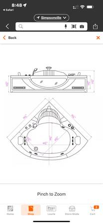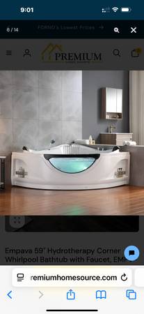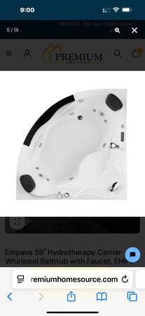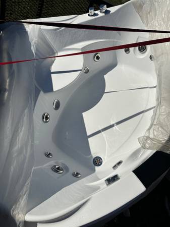 New and never installed 59" L x 59" W x 25" H white acrylic left drain bathtub with jets and heater. It is too large for our bathroom.