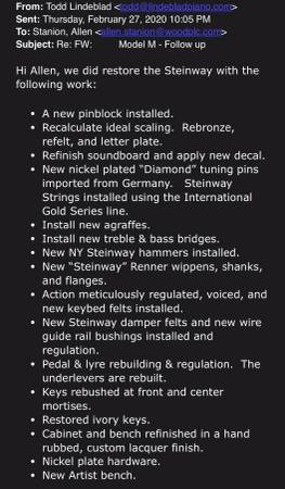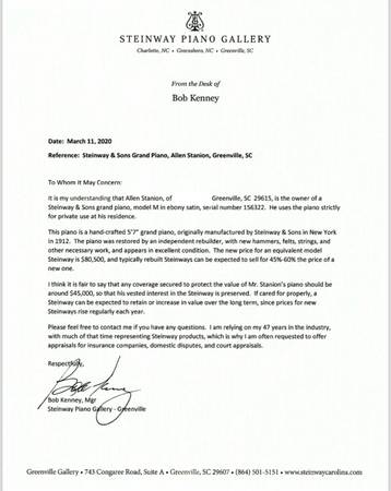 We are selling our Steinway Model M grand piano. It is in extremely nice condition and has been maintained and tuned by Steinway of Greenville from whom we bought it five years ago. It plays wonderfully. It has been appraised by Steinway of Greenville at $45,000 (see attached appraisal).