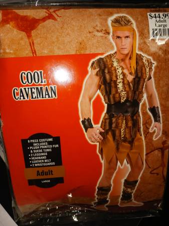 Men's large caveman costume with accessories including tooth & skull necklace, bones, and brown make-up. All on good condition. Call or text Rick at .