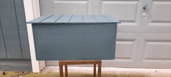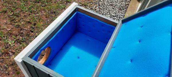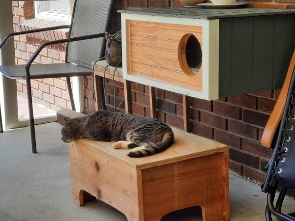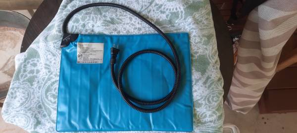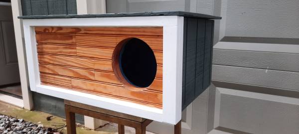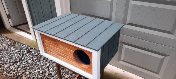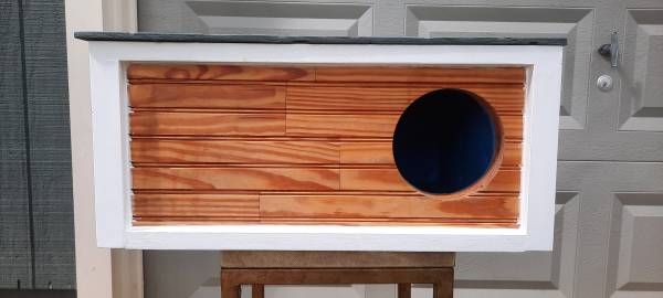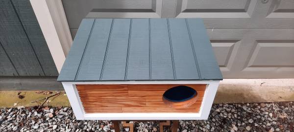 Small pet house. Heat pad fits perfectly in house. Pad stays a constant temperature. Insulated. Exterior caulk and paint. Removable lid.