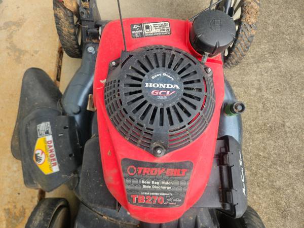 SELF PROPELLED TROY BILT MOWER WITH HONDA ENGINE. NEEDS TO HAVE GAS TANK DRAINED TO GET RID OF BAD GAS.